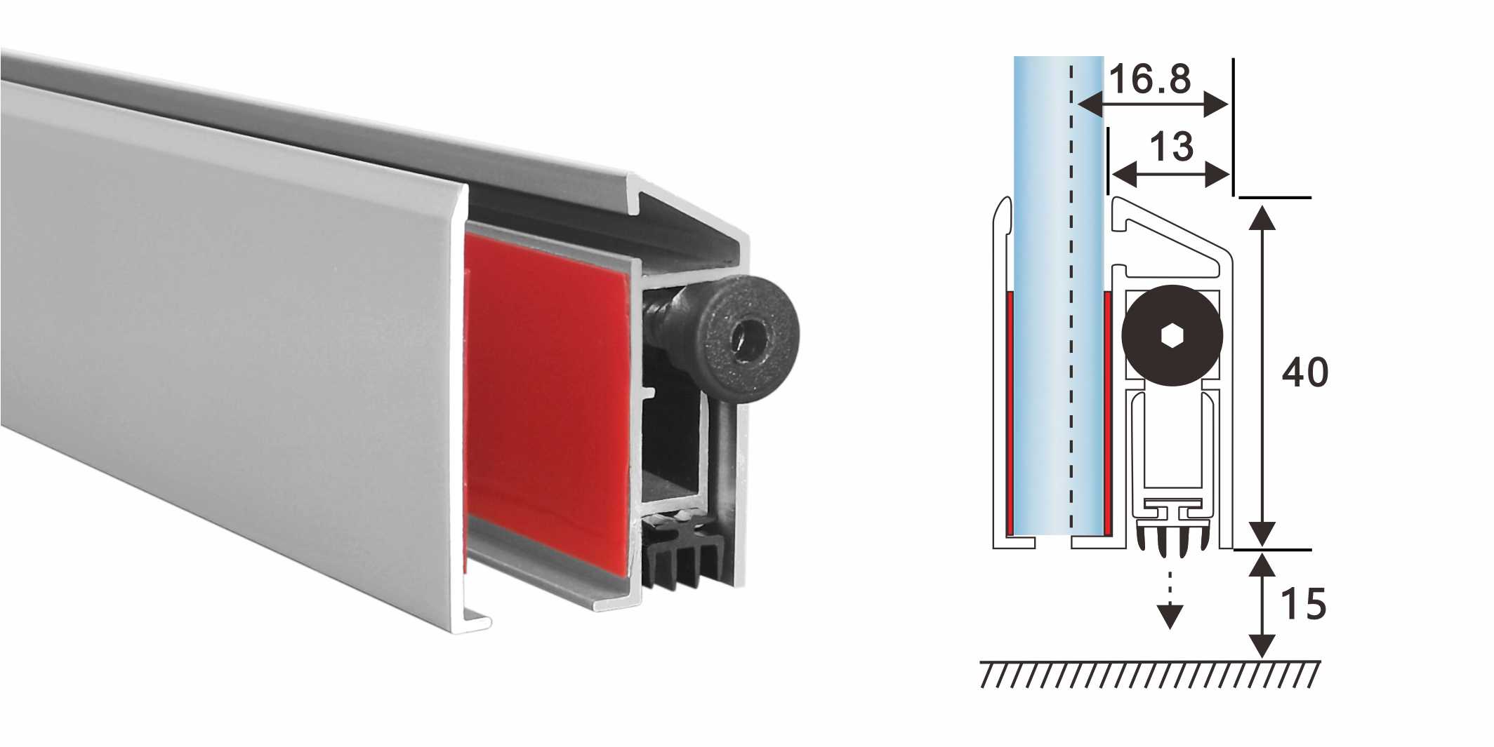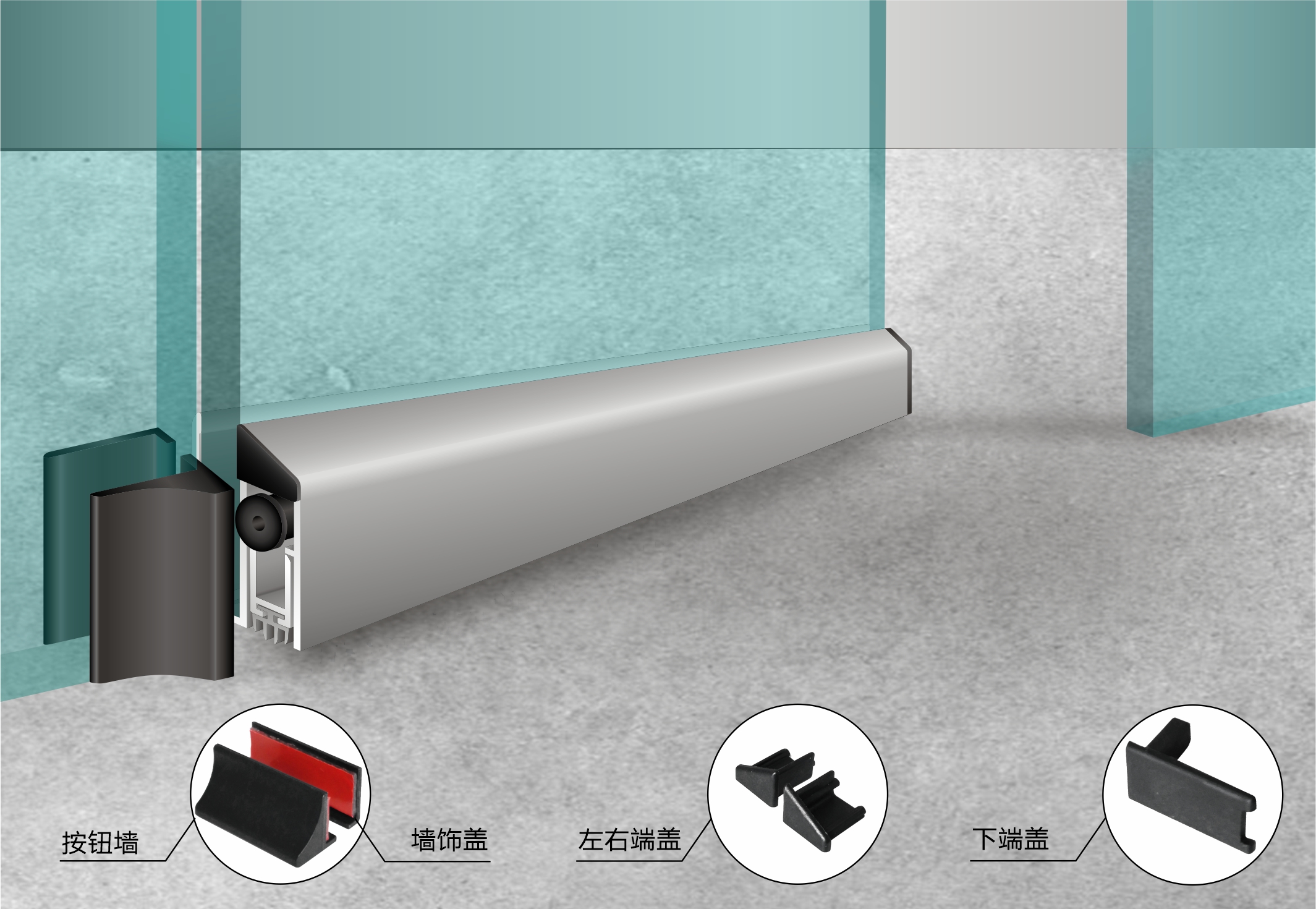 為平開純玻璃門,鋁合金窗框玻璃門,不銹鋼框玻璃門,木框玻璃門特別設計的門底自動升降式密封器。附件配套齊全,能適應有門框或無門框的玻璃門。帶磨砂表面的正面和背面的鋁合金裝飾條,產品表面無螺絲,平整美觀。
