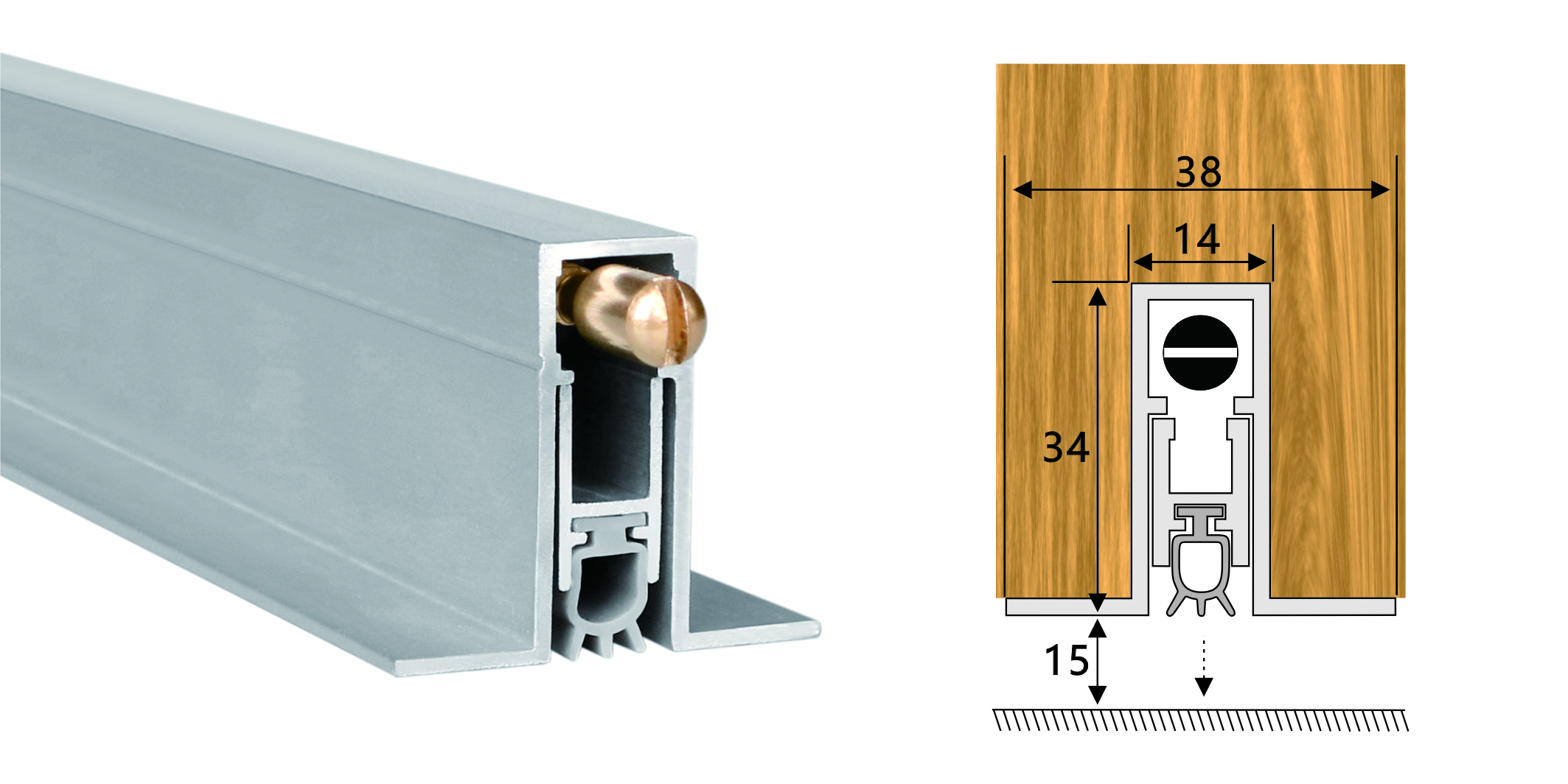 嵌入式門底自動升降式密封器,四連桿機構,適用于門扇內開槽的門。安裝時需在門底有一個34mm*14mm的通槽,將產品放置其中,將兩端蓋板和密封器用螺絲固定(或用螺絲從密封條底部向上固定),使用本產品不影響門的整體風格。